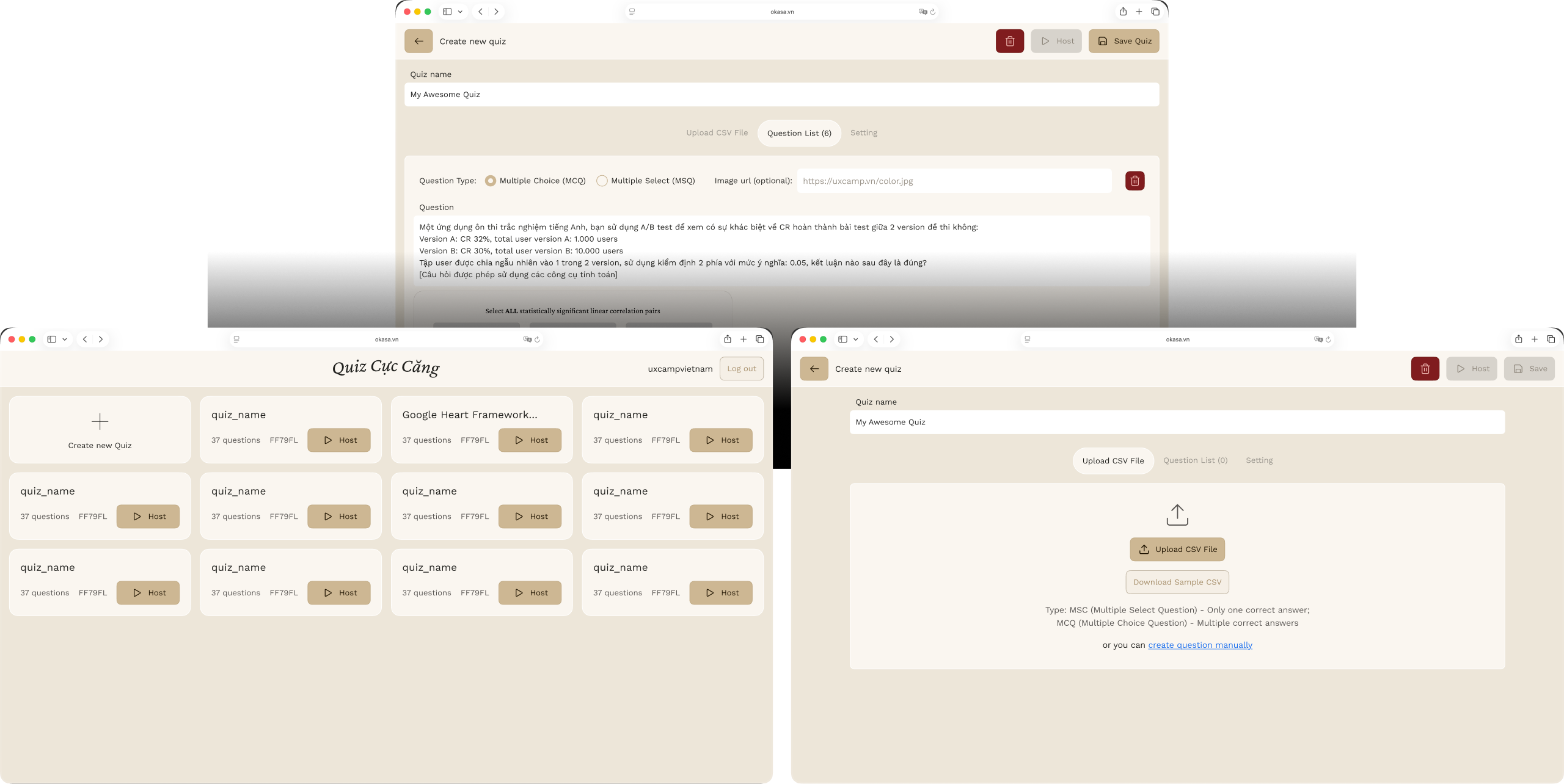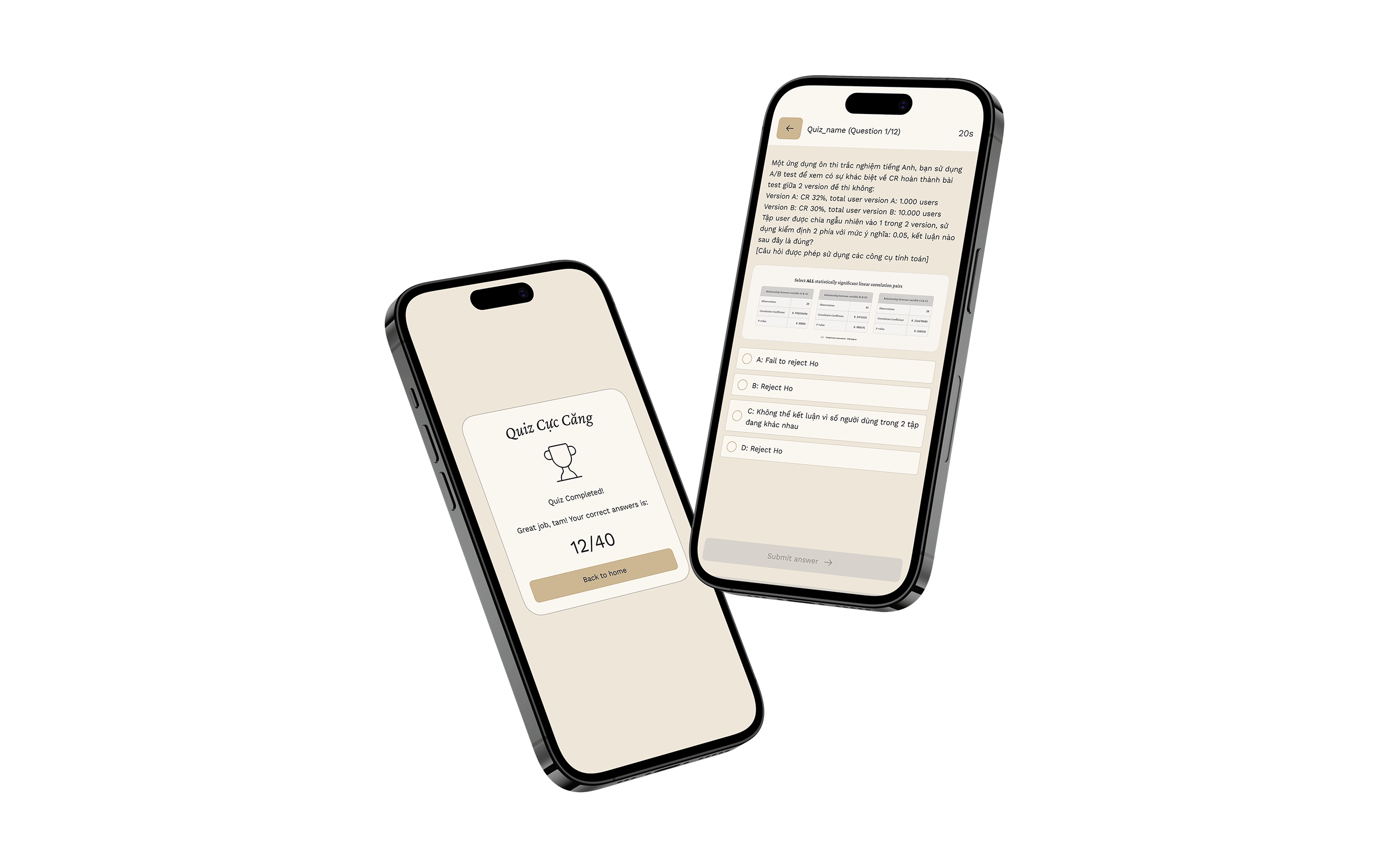 Khi thiết kế ứng dụng quiz, AC (Acceptance Criteria) là nhanh chóng tạo quiz từ bộ đề và cho người tham dự test.