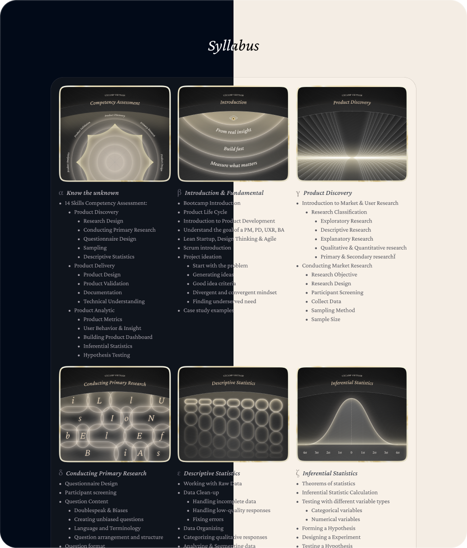 Chương trình được thiết kế để người tham dự được đặt mình vào một môi trường phát triển sản phẩm với đầy đủ quy trình từ nghiên cứu, xác định mục tiêu, đưa ra quyết định dựa trên dữ liệu và đo lường lại các chỉ số sản phẩm. Từ đó nâng cao năng lực phát triển sản phẩm số một cách bài bản, linh hoạt và có thể mở rộng.